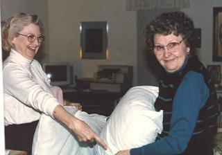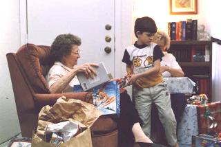 Yeah, well HO HO HO! Christmas in Corpus Christi with the "Grandfolks". Shot 1 is Mary lounging next to the tree. Shot 2 is Robert being Santa to his great aunt Gerry. Shot 3 is Gramps opening his new CD changer. Shot 4 is of the two sisters, Tomie (grandmom) and Gerry, trying to agree on how to make a day bed. The bottom shot is Robert and Glen sitting down to stuff their faces. |